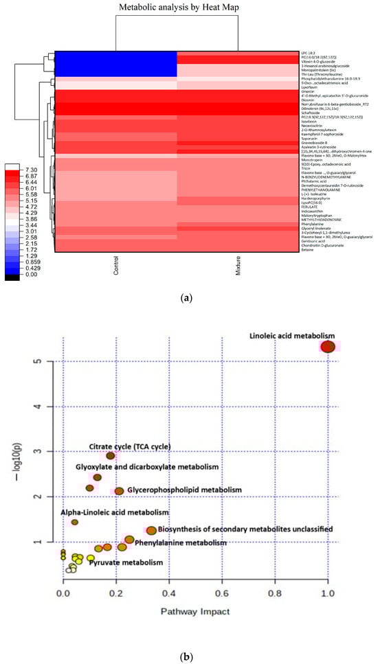 Metabolic profiling reveals the effect of mixture treatment on metabolites of wheat leaves: (a) 47 metabolites displayed, both upregulated and downregulated; (b) identifying the altered metabolic pathways by the mixture treatment. The color and size of each value based on the p-values and pathway impact values.