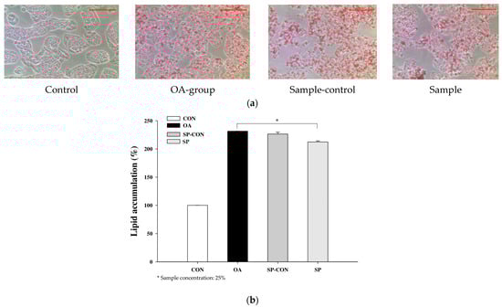 The cells were initially treated with a mixture extract for 24 h to assess lipid accumulation using oil red O staining (ORO). The results illustrated the capability of OA (oleic acid) to induce lipid accumulation. No steatosis was observed using ORO staining in the control group; however, after OA treatment, the accumulation of lipid droplets in the cytoplasm of HepG2 cells was observed. The morphology of the stained cells with lipid accumulation is shown in Figure 6a. The presence of distinct red lipid droplets surrounding the cells in the model group indicated a successful induction group. The accumulation of lipid droplets amounted to 231.52% in the induction group (OA), 226.46% for SP-CON, and 212.42% in the SP group. As compared to the OA-induction group, the SP (mixture) treatment showed reduced lipid accumulation and significantly enervated lipid fusion in HepG2 cells after 24 h, as depicted in Figure 6b.