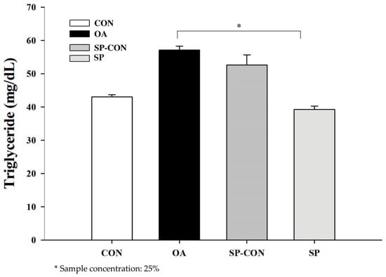 Effect of Mix-HW on cellular triglyceride (TG) accumulation. CON—control group; induction group (OA); SP-CON (DW); and SP (mixture treatment). The concentration of triglycerides was normalized with protein content. Data are presented as the mean ± SEM of three independent experiments (ANOVA; p < 0.05).