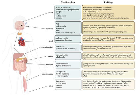 PMDs are the most frequent genetic metabolic disorders in humans, with a prevalence of approximately 1 in 4300 cases [1]. Pathogenic variants in all 37 mitochondrial DNA (mtDNA) genes and in more than 400 nuclear DNA genes have been associated with direct or indirect defects of the OXPHOS, which is the hallmark of these diseases [2]. These unique features of mitochondrial genetics and their ubiquitousness in human tissues explain PMDs’ vast clinical heterogeneity. PMDs are multisystemic diseases, mainly affecting high-energy demanding tissues, such as the muscles and central and peripheral nervous systems. Age of onset is variable, with the most severe defects generally appearing in childhood [3]. Cellular mtDNA polyplasmy, tissue heteroplasmy (proportion between normal and mutant mtDNA variants), mitotic segregation (mtDNA’s stochastic distribution during cell division), and the phenotypic threshold effect (tissue specific sensitivity to oxidative metabolism defects), are not sufficient to explain PMDs’ clinical heterogeneity [2,4,5]. For example, they cannot elucidate tissue specific alteration in individuals harboring homoplasmic mtDNA mutation, the absence of clear correlation between heteroplasmy level and disease severity, or the heterogeneous manifestations in nuclear DNA-related PMDs [4]. For mtDNA-related PMDs, environmental factors, other nuclear or mitochondrial mutations, mtDNA haplotype or tissue-specific nuclear gene expression patterns, and a complex molecular and metabolic cellular compensation response to OXPHOS defect may act as modifiers [2,4,5]. For nuclear DNA-related PMDs, the lack of complexity comprehension is even greater. It is important to underline that some of the abnormalities of nuclear genes involved affect mtDNA replication and the expression system (mtDNA maintenance), causing dysfunctions of the intergenomic signaling (manifesting with multiple mtDNA deletions or mtDNA depletion), and have combined features of mendelian and mitochondrial genetics [2]. Because of the vast clinical and genetic variability, diagnosing PMDs can be challenging. Given this, with this narrative review we aimed to dissect the most common “red flags” that could help clinicians in recognizing, diagnosing, and managing PMDs. For each red flag, we have outlined the pathogenetic mechanism, its presence in certain syndromic pictures, and the association with other phenotypic manifestations. For this purpose, to help the readers orient themselves in this maze, we summarized in Table 1 the main phenotypic characteristics of well-defined PMDs and their main genetic etiology.