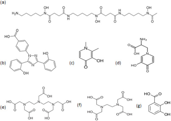 The structure of the iron-chelating drugs and other chelators with clinical effects. The iron-chelating drugs deferoxamine (a), deferasirox (b) and deferiprone (c) are widely used for the treatment of transfusional iron overload. Mimosine (d) and 2,3-dihydroxybenzoic acid (g) are iron-binding phytochelators with clinical potential. Diethylenetriaminepentacetic acid (DTPA) (e) and ethylenediaminetetracetic acid (EDTA) (f) are synthetic iron-binding drugs used for general metal detoxification.