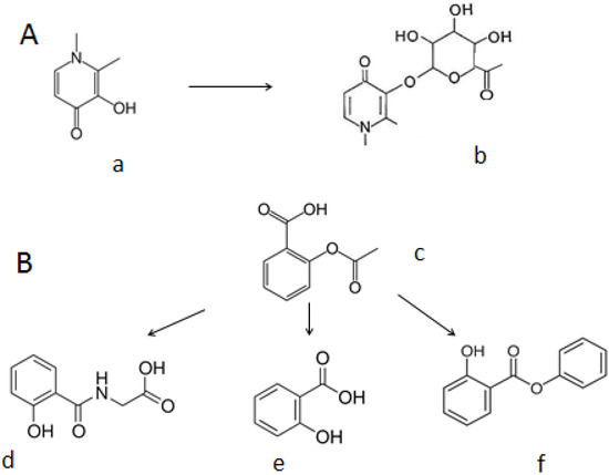 The metabolic transformation of deferiprone and aspirin. (A) Deferiprone (a) is metabolized to a glucuronide conjugate at the 3-OH group of the chelating site of deferiprone, forming deferiprone glucuronide (b), which has no iron-binding potential. (B) Aspirin (acetylsalicylic acid) (c) is metabolized to several metabolites including salicyluric acid (d), salicylic acid (e) and salicylic phenol (f), all of which have iron-binding affinities and form iron complexes (see related references [271,272,273]).