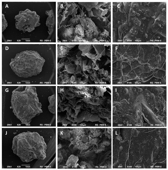 SEM images of G1 (A–C), G2 (D–F), G3 (G–I), and G4 (J–L) granules. The first column: whole granules; the second column: an internal cross-section; the third column: an outer surface.