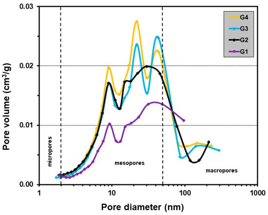 The porosity and specific surface area (SBET) of the G1, G2, G3, and G4 samples, the total pore volume (VC), and the distribution of their diameters (in the range of 2–300 nm) were determined from the N2 adsorption isotherm in the relative pressure range of p/p0 = 0.02–0.99 using the Brunauer–Emmett–Teller (BET) method with nitrogen adsorption (ASAP 2050 Micromeritics, Georgia, GA, USA).