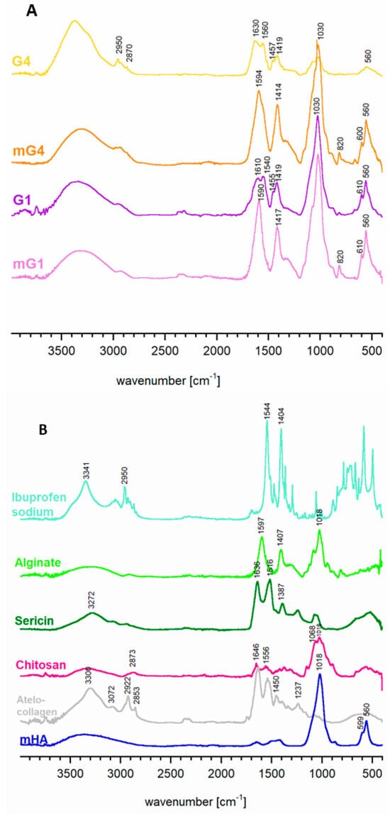 The FT-IR representative spectra of two distinct matrix types, denoted as mG1 and mG4, along with the corresponding granules (G1 and G4) incorporating the drug substance, are illustrated in Figure 3A. Additionally, Figure 3B displays the spectra of mHA, atelocollagen, alginate, chitosan, sericin, and ibuprofen sodium for a comparative analysis.