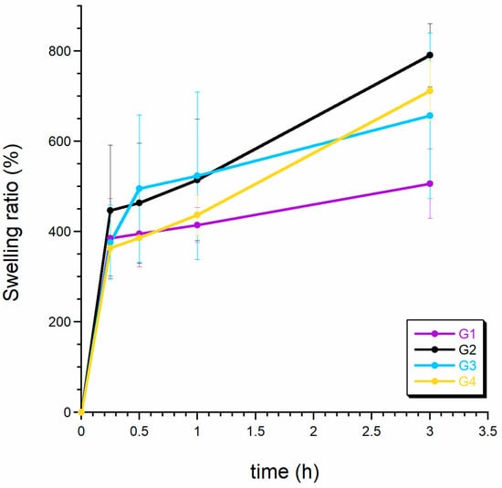 In general, it was observed that all materials swiftly achieved their maximum swelling ratio (SR). This phenomenon is likely attributable to the foamy and highly porous structure of the matrices, facilitating efficient water penetration [,]. Sample G1 displayed the lowest water absorption, potentially linked to its reduced pore volume (refer to the porosity results discussed earlier). This aligns with the established notion that denser materials tend to diminish the water-absorption capacity [].