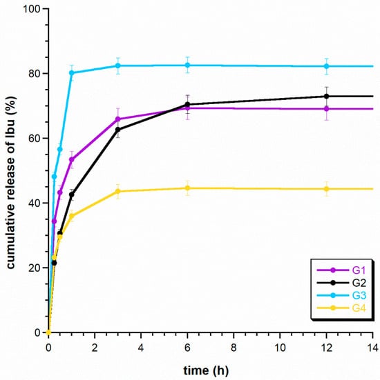 Figure 5 shows the cumulative release curves of ibuprofen for the obtained granules. The graph shows the release up to 12 h, because no significant changes in the amount of drug released were observed thereafter. As expected, ibuprofen was rapidly released from all composite granules obtained within the first three hours and took the form of burst-release profiles. Each sample released more than 40% of the initially loaded drug within 3 h. It is worth paying attention to the G3 sample, where ibuprofen was released rapidly and, in fact, was over 80% released within 3 h. G1 and G3 had similar drug-release profiles over the studied time range. They showed the highest release effect extremely quickly, because after 1 h, the release reached 54% and 66% for G1 and G3, respectively. Samples G2 and G4 were characterized by slightly different curves. The release of Ibu was slightly slower—within 1 h, the release reached 43 and 36%, respectively. Interestingly, the maximum amount of drug released from the G4 sample during the tested 12 h was only 45%. It can be assumed that the reason for the slower release of ibuprofen may be the covering of the granules with chitosan, which significantly reduced their permeability during this time. These types of ibuprofen release profiles could be useful when an immediate high dose is required, such as in acute infections or inflammation [,]. We assume that a thicker chitosan coating with a greater degree of cross-linking could slow down the release of the drug, which would be beneficial, for example, when administering antibiotics [].