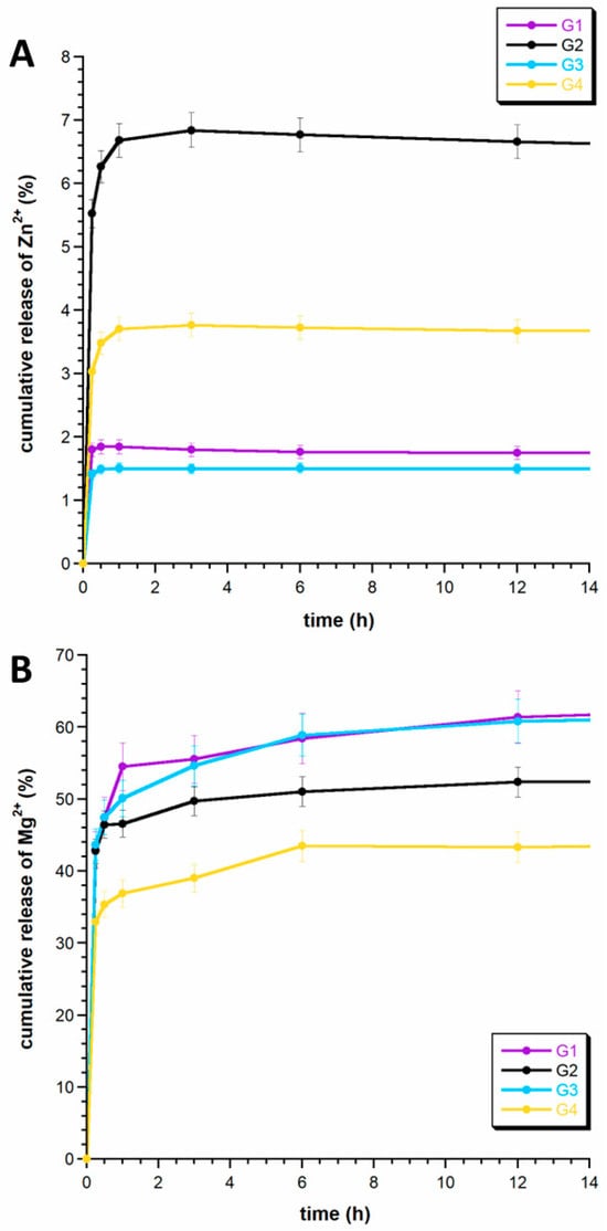 In the next step, the release of zinc and magnesium ions, incorporated into the mineral phase of the granules (mHA), was executed. Cumulative release curves for the ions spanning a 12 h duration are delineated in Figure 6A,B. After 12 h, no significant changes in the release profile were observed. A pronounced disparity was evident in the release kinetics of magnesium and zinc ions across all granules, with magnesium exhibiting a notably higher degree of release in comparison to zinc.