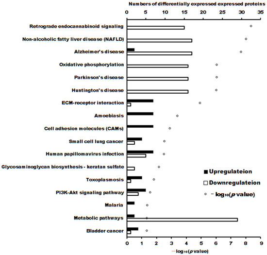 | Retrograde endocannabinoid signaling | 1.44 × 10−11 | down | Mitochondrial NADH-ubiquinone oxidoreductase 75 kDa subunit, NADH dehydrogenase [ubiquinone] flavoprotein 1, mitochondrial, cDNA FLJ75930, highly similar to Homo sapiens NADH dehydrogenase (ubiquinone) 1 alpha subcomplex, 9, 39 kDa (NDUFA9), mRNA, NADH dehydrogenase [ubiquinone] flavoprotein 2, mitochondrial, NDUFA7 protein (Fragment), NADH dehydrogenase (Ubiquinone) Fe-S protein 5, 15 kDa (NADH-coenzyme Q reductase), NADH dehydrogenase [ubiquinone] 1 alpha subcomplex subunit 6, NADH dehydrogenase [ubiquinone] 1 alpha subcomplex subunit 2, NADH dehydrogenase [ubiquinone] iron-sulfur protein 4, mitochondrial, NADH dehydrogenase [ubiquinone] iron-sulfur protein 8, mitochondrial, NADH dehydrogenase [ubiquinone] 1 alpha subcomplex subunit 12 (Fragment), NADH dehydrogenase [ubiquinone] iron-sulfur protein 7, mitochondrial, NADH dehydrogenase [ubiquinone] 1 alpha subcomplex subunit 3, NADH dehydrogenase [ubiquinone] 1 beta subcomplex subunit 3, Uncharacterized protein (Fragment) |