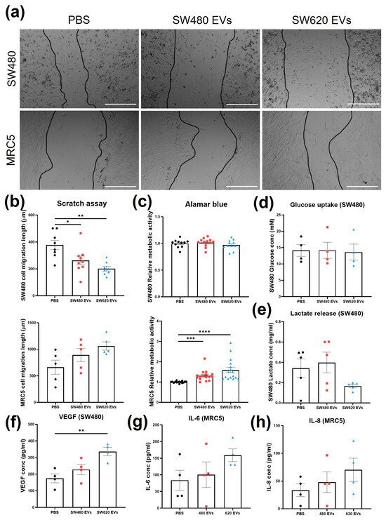 Cellular responses upon treatment with SW480 EV, SW620 EV, or PBS. (a) Representative images of scratch migration assay of SW480 and MRC5 cells at 36 h of treatment. Scale bar = 500 µm. (b) Migration length of SW480 and MRC5 cells at 36 h of treatment. (c) SW480 and MRC5 cell metabolic activity with Alamar blue assay. (d) Glucose uptake of SW480 cells. (e) Lactate production by SW480 cells. (f) VEGF concentration of SW480 cells. (g) IL-6 release by MRC5 cells. (h) IL-8 release by MRC5 cells. All data are presented as mean ± SEM; n ≥ 3 per group. One-way ANOVA with Tukey’s post hoc test, * p < 0.05, ** p < 0.01, *** p < 0.001, **** p < 0.0001.