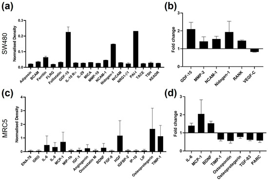 To expand the panel of potential measures that could show responses to CRC EVs, the supernatants from SW480 cells treated with SW620 EVs were compared to those of untreated cells using a cytokine array of 51 targets (including proteolytic enzymes) and the full list of results can be found in Table S1, Supplementary Material. The threshold of signal intensity >0.01 was reached by 18 cytokines (Figure 3a). Cytokines with consistent fold change (SW620Evs/PBS) among biological replicates were considered for the selection of the most differentially expressed markers (Figure 3b), resulting in six cytokines: GDF-15, MMP-2, NCAM-1, Nidogen-1, RANK, and VEGF-C. Similarly, a cytokine array containing 80 immune-related cytokines was undertaken on the supernatants from MRC5 fibroblasts treated with SW620 EVs and compared to those of untreated fibroblasts (Table S2, Supplementary Material). Seventeen cytokines were found to be highly expressed (>0.01) by MRC5 fibroblasts (Figure 3c). When the difference between control and treatment was considered, 8 cytokines (IL-6, MCP-1, BDNF, TIMP-1, osteopontin, osteoprotegerin, TGF-β3, and PARC) were found with constant fold change between biological replicates (Figure 3d).