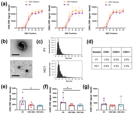 Plasma EV characterization. (a) DELFIA immunosensitive assay for tetraspanins CD9, CD63, and CD81 in isolated SEC fractions; n = 3. (b) Representative TEM images of different sizes of Evs found in the pooled SEC fractions from CRC patients. Scale bar = 100 nm. (c) Representative nanoflow cytometry event/size curves of CRC patients and HCs. (d) Percentage of positivity of the three tetraspanin markers, CD9, CD63, and CD81, detected with nanoflow cytometry of CRC patients and HCs. (e) DELFIA immunosensitive assay for CD9 found in pre-SEC plasma derived from HCs and CRC patients (M0, M1); n = 6, mean ± SEM, one way ANOVA, * p < 0.05. (f) DELFIA immunosensitive assay for CD63 found in pre-SEC plasma derived from HCs and CRC patients (M0, M1); n = 6, median ± 95% CI, Kruskal–Wallis * p < 0.05. (g) DELFIA immunosensitive assay for CD81 found in pre-SEC plasma derived from HCs and CRC patients (M0, M1); n = 6, median ± 95% CI, Kruskal–Wallis.