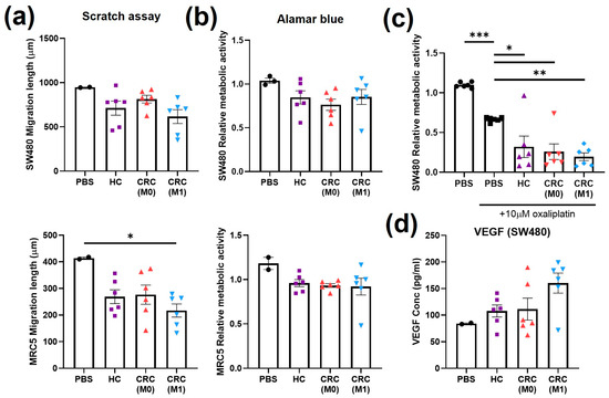 The assays previously performed to test the responses of cells to CRC EVs derived from cell lines were then applied to evaluate the responses to plasma EVs derived from patients. The assays were grouped according to their roles as cancer hallmarks. The treatments with plasma EVs were normalised to the volume, as no significant differences in particle concentration were found between patients (Figure 4c). An equal volume of PBS was also used as a control to normalise against the elution of the EV treatment. SW480 and MRC5 cell migration was generally reduced by conditioning with all plasma EV types compared to the PBS control (p > 0.05, Figure 5a) but was only significantly lower when MRC5 cells were treated with M1 plasma EVs (p < 0.05). A non-significant decrease (p > 0.05) in metabolic activity indicated by the Alamar blue assay after plasma EV conditioning compared to the PBS control was also observed, independent of the origin of the plasma (Figure 5b). The metabolic assays (glucose uptake and lactate production), which did not show significant differences after cell line EV conditioning, were replaced by analysis of SW480 drug resistance by co-treatment with plasma EVs and oxaliplatin. Significant decreases in metabolic activity were observed between the PBS control and oxaliplatin-only control (p < 0.001), oxaliplatin-only control and HC (p < 0.05), oxaliplatin-only control and M0 (p < 0.05), and oxaliplatin-only control and M1 (p < 0.01) (Figure 5c). M1 plasma EV conditioning induced non-significant increases in VEGF-A levels found in SW480 supernatant compared to the PBS control (p = 0.1509), HC plasma EVs (p = 0.1657), and M0 plasma EVs (p = 0.2114) (Figure 5d).