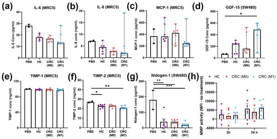 Further analysis of inflammatory and matrix remodelling features recently defined in the hallmarks of cancer were performed after treatment with plasma EVs. Levels of IL-6 released by MRC5 cells decreased (not significantly, p > 0.05) with all plasma EV treatments compared to the PBS control (Figure 6a). Similarly, non-significant decreases (p > 0.05) in IL-8 levels in the MRC5 cell supernatant were observed after all plasma EV treatments compared to the PBS control (Figure 6b). One value in the M1 group was separated compared to rest of the patients in both IL-6 and IL-8. No main differences were found in MCP-1 from the MRC5 cell supernatant (Figure 6c). GDF-15 was tested in the SW480 supernatant and levels increased after plasma EV treatments, with a statistically significant increase after M1 plasma EV treatment compared to the PBS control (p < 0.05, Figure 6d). No main differences were found in TIMP-1 from the MRC5 cell supernatant (Figure 6e). TIMP-2 levels in MRC5 were significantly reduced after HC (p < 0.05) and M1 (p < 0.01) plasma EV treatments and non-significantly reduced after M0 plasma treatment (p = 0.0517) (Figure 6f). Nidogen-1 levels in the SW480 supernatant were significantly lower after all three plasma EV treatments compared to the PBS control (HC p < 0.01, M0 p < 0.01, and M1 p < 0.001) (Figure 6g). Finally, the matrix metalloproteinase activity of SW480 cells was tested at two different time points, but no significant changes were observed between the plasma EV treatment groups (Figure 6h).