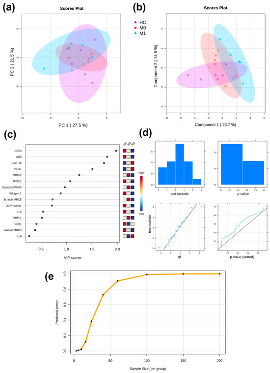 Multivariate analysis of cellular responses to plasma EVs. (a) Unsupervised PCA with 95% confidence ellipses. (b) Supervised PLS-DA with 95% confidence ellipses. (c) VIP scores from PLS-DA showing discriminating variables. Important features are found with VIP score > 1. (d) Plots overviewing the test statistics and p-values calculated from the pilot data to evaluate whether they follow a normal distribution. (e) Predicted power curve for FDR = 0.1 (significance criterion) and maximum size cohort of 100 patients per group. Curve saturation at 100 patients per group.