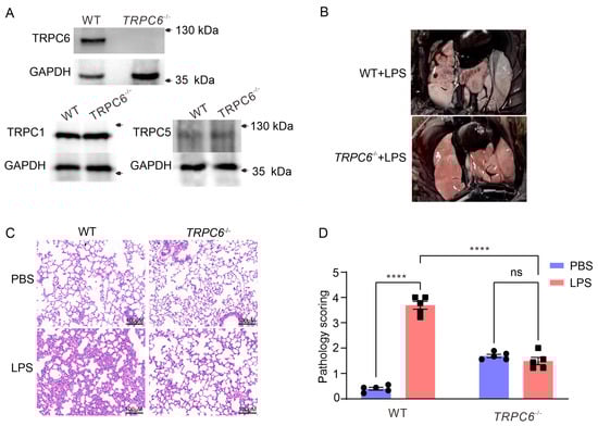 Lung tissues were collected from wild—type (WT) and TRPC6-/- male mice. Immunoblot analysis was performed to assess the expression of TRPC1, TRPC5, and TRPC6 in lung tissue. As depicted in Figure 1A, complete ablation of TRPC6 was observed in TRPC6-/- mice without any impact on the expression levels of TRPC1 and TRPC5. A significant leakage of Evans Blue from the lungs was observed in WT mice treated with LPS, whereas TRPC6-/- mice exhibited reduced permeability (Figure 1B). To further assess whether TRPC6 knockout reduced lung inflammation in LPS—treated mice, we examined lung tissue sections using H&E. As shown in Figure 1C,D, LPS treatment caused alveolar distortion, hemorrhage, and immune cell infiltration in the lung sections of WT mice, whereas these histological changes were attenuated in TRPC6-/- mice. Compared to the WT—PBS group, the lung injury score was significantly increased in the WT—LPS group (Figure 1D, 0.40 ± 0.06 vs. 3.69 ± 0.16, n = 5, **** p < 0.0001), while there was no significant difference between the TRPC6-/-—PBS and TRPC6-/-—LPS groups (Figure 1D, 1.69 ± 0.065 vs. 1.49 ± 0.14, n = 5, p = 0.24). These data indicated that knockout of TRPC6 improves LPS—induced histopathological changes in male mice.