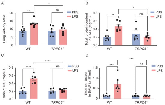 Sex—specific differences in physiological characteristics of lung tissue play a significant role as heterogeneous factors in the development of lung diseases. Solopov et al. demonstrated that the chemically induced mouse model of lung fibrosis resulted in lower total leukocyte count and total protein content in female mouse BALF than their male counterparts []. In our study, female mice exhibited resistance to LPS—induced lung edema, but the neutrophil infiltration in BALF in LPS—treated mice is still significantly higher than that in sham mice. Nevertheless, TRPC6-/- mice treated with LPS did not exhibit any significant differences in neutrophil infiltration and total cell counts in the BALF when compared with WT female mice treated with LPS (Figure S2A–E). Both TRPC6-/- male and female mice demonstrated resistance to LPS—induced increases in total cells and neutrophils in BALF lung injury.