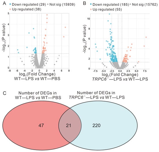 Differential analysis results. (A) Volcano plot illustrating the outcomes of differential expression analysis between WT—LPS and WT—PBS groups. (B) Volcano plot demonstrating the differential expression analysis results between TRPC6-/-—LPS and WT—LPS groups. (C) Overlapping genes identified as differentially expressed in both comparisons, i.e., WT—LPS vs. WT—PBS and TRPC6-/-—LPS vs. WT—LPS. Note: p < 0.05, |log2Fold Change| > 0.58.