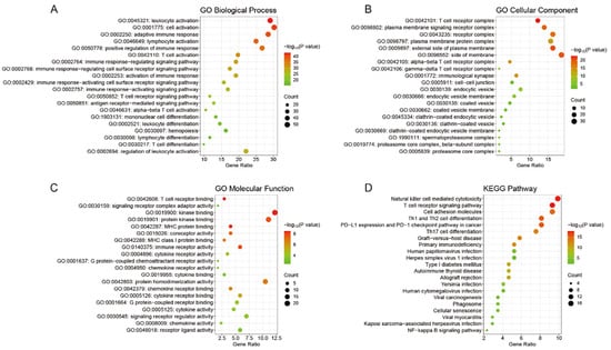 Enrichment Analysis Results. (A) GO Biological Processes analysis results for differentially expressed genes in TRPC6-/-—LPS vs. WT—LPS. (B) GO Cellular Components analysis results for differentially expressed genes in TRPC6-/-—LPS vs. WT—LPS. (C) GO Molecular Functions analysis results for differentially expressed genes in TRPC6-/-—LPS vs. WT—LPS. (D) KEGG Pathway enrichment analysis results for differentially expressed genes in TRPC6-/-—LPS vs. WT—LPS.