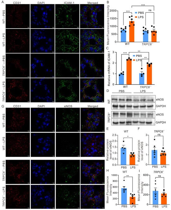 To further confirm the association between TRPC6 and eNOS in LPS—induced ALI, we assessed the expression of eNOS in male mouse lung tissue. Our findings revealed a significant reduction in eNOS expression in the lung tissue from WT mice treated with LPS (Figure 5D,E, 1.45 ± 0.21 vs. 0.87 ± 0.06, n = 4–6, * p < 0.05); However, there were no significant changes in eNOS expression in TRPC6-/- mice treated with LPS (Figure 5D,F, 1.49 ± 0.26 vs. 1.22 ± 0.12, n = 5–6, p = 0.36). The results were further validated through immunofluorescence analysis, wherein CD31 was employed as a marker for blood vessels in the lung tissue (Figure 5G–I). Notably, a significant decrease in eNOS fluorescence intensity was observed in CD31—positive endothelial cells of the LPS—treated WT group (557.0 ± 58.71 vs. 261.7± 50.33, n = 6, ** p < 0.01), while no difference was observed between the TRPC6-/-—PBS and TRPC6-/-—PBS LPS groups (280.4 ± 60.39 vs. 225.2± 24.34, n = 6, p = 0.4156).