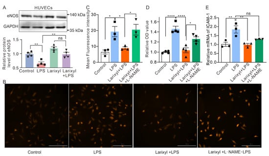 The cells were divided into 4 groups: control, LPS (20 ng/mL) group, LPS in the presence of larixyl acetate (10 μM) group, LPS in the presence of larixyl acetate (10 μM), and L—NAME (10 μM) group. After the cells in 6—well plates were normally cultured for 24h, they were treated with larixyl acetate or larixyl acetate + L—NAME for 1h and then with LPS for 5h.