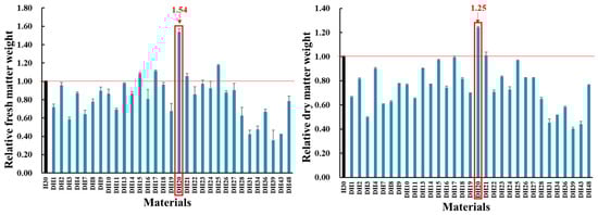Comparison of relative fresh and dry weight between H30 and mutagenic materials under 360 mM salt concentration at 28 d seedling stage (Zadoks growth scale 19). The relative fresh or dry weight was calculated by comparing the value obtained under salt stress versus control conditions. The relative value for H30 is shown as 1.00, and the relative value for other DH lines is shown as relative to H30. The red line is presented to distinguish the higher relative value for DH lines relative to H30. The red arrows and frame indicate the performance of DH20. All data represent four biological replicates.