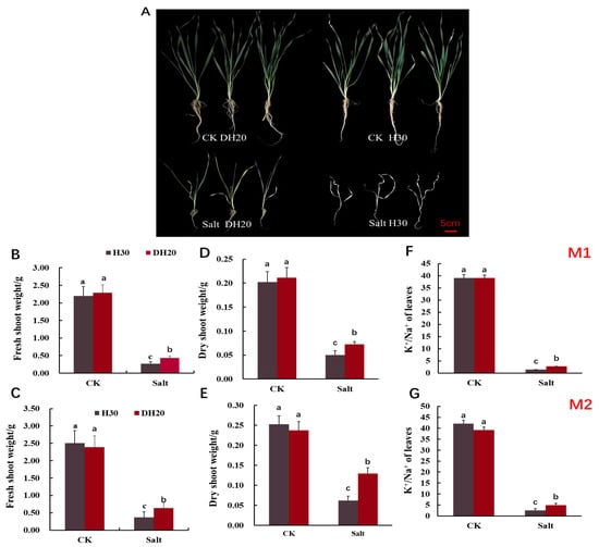 Comparison of H30 and DH20 at 28 d seedling stage (Zadoks growth scale 19) under CK and salt conditions. (A) Growth performance; fresh shoot weight in M1 (B) and M2 (C); dry shoot weight in M1 (D) and M2 (E); K+/Na+ of leaves in M1 (F) and M2 (G). M1 and M2 represents mutagenesis 1 and 2 generation, respectively. Different letters indicate significant differences at the 0.05 level by Student’s t test. All data represent three biological replicates. CK: control; Salt: salt condition.