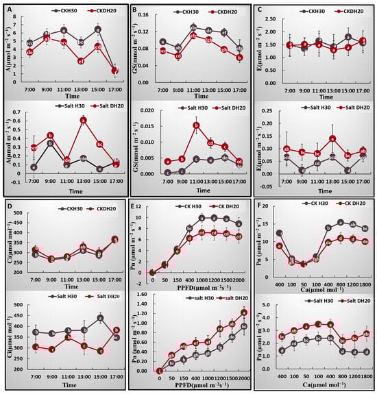 Comparison of photosynthetic characteristics between H30 and DH20 under CK and salt conditions. (A) Net photosynthetic rate (A), (B) stomatal conductance (Gs), (C) transpiration rate (E), (D) intercellular CO2 concentration (Ci), (E) response to photosynthetic photon flux density (PPFD), (F) response to ambient CO2 concentration (Ca). Different letters represent significant differences at 0.05 levels between DH20 and H30 under varying supply of time or PPFD or Ca (n = 10).