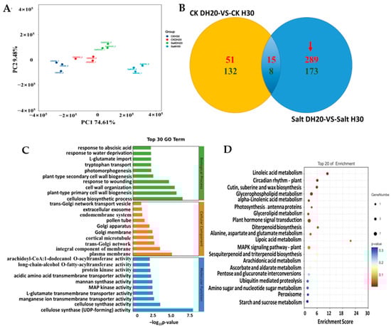 Analysis of specific differentially expressed genes (DEGs). Principal component analysis (PCA) (A) and Venn diagrams (B) of DEGs in H30 and DH20 under control and salt stress conditions. Up- and down-regulated DEGs are shown in red font and green font, respectively. Red arrow represents the specified DEGs in DH20. (C) Gene Ontology (GO) analysis. The gene ontology analysis of biological processes (green), cellular component (orange) and molecular function (blue) are indicated on the y-axis; −log10p-value is indicated on the x-axis. (D) Kyoto Encyclopedia of Genes and Genomes (KEGG) analysis. The p value is presented in a color scale; the size of the dots represents DEG number mapped in each pathway.