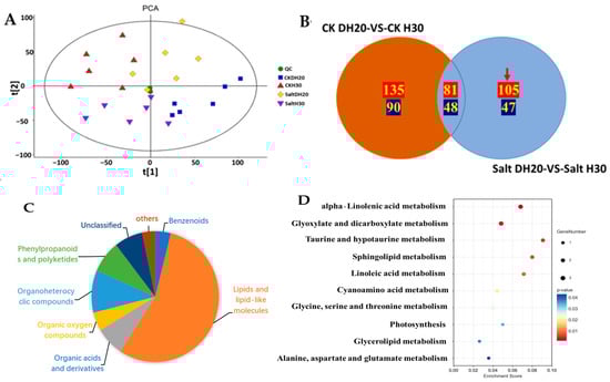 To construct a systematic profile of metabolic changes that occur in response to salt stress, untargeted metabolomic analysis was performed to compare and contrast H30 and DH20, using the same samples used for the transcriptomic analysis. Principal component analysis (PCA) was performed (Figure 5A,B). PCA showed that R2X [1] = 0.205 and R2X [2] = 0.126 of the total variance, and that QC samples were closely clustered together. It is indicated that the biological replicates grouped together, and that the metabolomic data had good stability and repeatability.