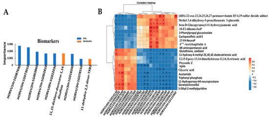 According to the combined transcriptome and metabolites analysis, nine key biomarkers, including two metabolites and seven genes, were identified; that is, 11,15-dichloro-docosane-1,14-disulfate,11-dehydro-2,3-dinor-TXB2, HORVU1Hr1G087690 (ubiquitin 5), HORVU5Hr1G073010 (nucleolar protein gar2-related isoform 5), HORVU2Hr1G003860 (receptor kinase 1), HORVU7Hr1G062810 (GTPase Era), HORVU0Hr1G022030 (VQ motif family protein), HORVU3Hr1G018200 (pentatricopeptide repeat (PPR) superfamily protein) and HORVU3Hr1G078550 (basic-leucine zipper (bZIP) transcription factor family protein) (Figure 6A).