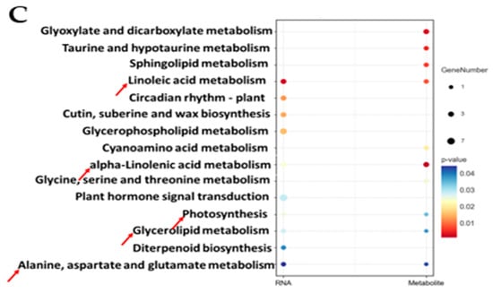 KEGG analysis revealed that the five most significant common enrichment pathways were linoleic acid metabolism, alpha-linolenic acid metabolism, glycerolipid metabolism, photosynthesis, and alanine, aspartate and glutamate metabolism (Figure 6C). Based on this, these metabolic pathways were selected for further analysis.