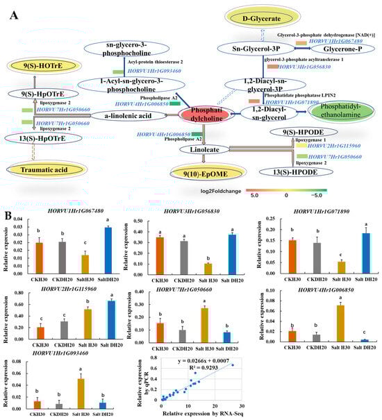 Overview of part of linoleic acid, alpha-linolenic acid and glycerolipid metabolism in response to salt stress. (A) Pathway. The oval represents the metabolites and the significantly up- and down-regulated metabolites at p < 0.05; those that are VIP > 1 are indicated in colored fonts. The changed DEGs are highlighted by blue font, and the colored rectangle before DEGs represents the value of the log2 foldchange (salt DH20 vs. salt H30). The solid and dotted lines with arrows indicate direct or indirect interactions of the processes, respectively. The orange lines indicate processes in linoleic acid and alpha-linolenic acid metabolism, and the blue lines indicate glycerolipid metabolism. (B). Validation of seven DEGs by qPCR. The X axes represent the barley samples under CK conditions and salt treatment, and the Y axes represent the normalized relative quantity of gene expression. The normalized relative quantity (NRQ) is calculated as a target gene’s expression with respect to two endogenous reference genes: HvGAPDH and HvActin. Different letters indicate significant differences at the 0.05 level by Student’s t test. All data represent three biological replicates. Correlation analysis of the seven DEGs by qPCR and RNA-seq is also shown, and the Pearson correlation coefficient (R2) is 0.9293.