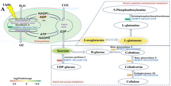In light reactions of photosynthesis, ADP(C00008) was the metabolite that significantly increased in DH20 when treated with the salt stress, while the gene HORVU5Hr1G117910 (ferredoxin 3) was down-regulated. Glyceraldehyde 3-phosphate (G3P) is a crucial component of the Calvin cycle for converting light energy into carbon compounds. The reduction in sucrose in DH20 under salt condition might be due to the conversion into UDP-glucose. The upregulated expression of HORVU4Hr1G011160 (endoglucanase 10) and HORVU5Hr1G095060 (beta-glucosidase C) might accelerate D-glucose accumulation. In alanine, aspartate and glutamate metabolism, although the content of 5-phosphonbosylamine did not change substantially, two DAMs (2-oxoglutarate and L-glutamate) and gene HORVU1Hr1G074460 (amidophosphoribosyltransferase) were found to be reduced (Figure 8A).