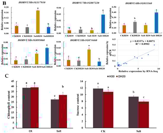 To confirm the validity of the RNA-seq-based transcript abundance of genes, five DEGs involved in the pathway were analyzed (Figure 8B). The data confirmed that the up-regulation of three genes (HORVU7Hr1G007220, HORVU4Hr1G011160 and HORVU5Hr1G095060) were found in DH20 when compared to H30 under salt stress. Two genes (HORVU5Hr1G117910 and HORVU1Hr1G074460) were down-regulated in DH20 compared to H30 under salt stress. The results showed that the expression patterns of these genes were consistent with the RNA-seq data (R2 = 0.8902) (Figure 8B).
