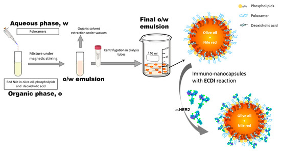Briefly, 20 mL of an aqueous phase under magnetic stirring formed by 50 mg of Pluronic® F68 was produced. An organic phase consisting of 125 μL of olive oil, 40 mg of Epikuron 145V, and 10 mg of deoxycholic acid (provides the -COOH groups to make the vectorization with antibody molecules possible) was dissolved by sonication in 10 mL of ethanol (98% synthetic grade) and strongly added to the first aqueous phase under magnetic stirring. The mixture turned milky immediately due to the formation of a nanoemulsion. The organic solvent, ethanol, plus a portion of the volume of water were evaporated in a rotary evaporator at 35 °C, giving a final volume of 16 mL. The sample was then cleaned of surfactant residues and other substances by borate buffer dialysis (1.13 mM and pH 10) with a 300 kDa membrane under magnetic stirring for 24 h at 4 °C. Additionally, NR fluorochrome was previously dissolved in the olive oil phase in order to synthesize nanocapsules loaded with these compounds inside.