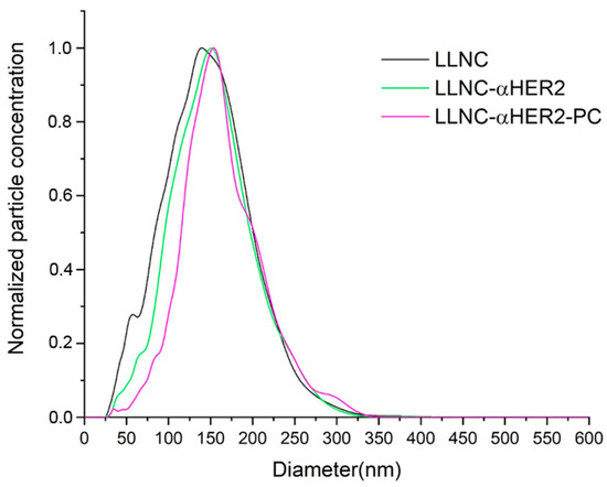 Hydrodynamic size distribution of the LLNCs, LLNCs-αHER2, and LLNCs-αHER2-PC measured at 25 °C with NTA technique in pH 7 buffer.