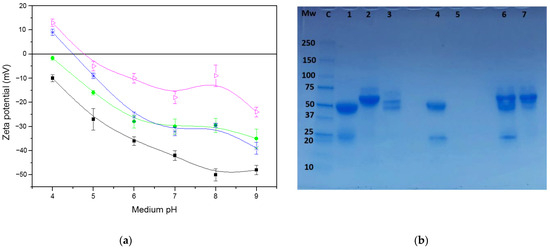 It is widely described that the presence of proteins at the surface of colloidal particles produces a modulation of the surface electric charge, closing the IEP of the complex to the specific IEP of each protein. The protein coverage is decisive and the higher the degree of coating, the greater the ability to alter the original surface charge [30,31,32]. The net charge of protein molecules, positive under IEP, has the capacity to screen the negative surface charge of bare nanocapsules. As shown in Figure 4a, there are variations in the zeta potential data of LLNCs-αHER2 with respect to LLNCs for all pHs, demonstrating that protein immobilization on the surface of the nanocapsules was successful. In this case, the low coverage degree of the antibody molecules partially modified the original surface charge, reducing the absolute zeta potential value of the LLNCs. Even so, from neutral to basic pHs, the zeta potential for LLNCs-αHER2 kept a sufficient negative value, around −30 mV, to prevent colloidal aggregation by an electrostatic repulsion mechanism [33]. This situation correlates with DLS and NTA (Table 1 and Figure 3) results for LLNCs-αHER2, where the PDI value (<0.15) and the narrow size distribution correspond to colloidally stable nanosystems. The coupling of the αHER2 antibody was finally confirmed by SDS-PAGE. As can be seen in Figure 4b, the free αHER2 lane (lane 1) shows the two characteristic bands at 25 and 50 kDa, corresponding to the molecular weight of the Fab fraction and Fc moieties of immunoglobulins. The same bands were found for the LLNCs-αHER2 sample (lane 4), while the sample corresponding to the elution volume from the coupling experiment (lane 5) reflects the absence of antibody bands.