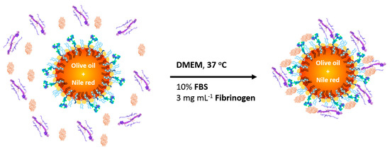 Poloxamer 188 (Pluronic® F68), N-(3-dimethylaminopropyl)-N′-ethyl-carbodiimide (ECDI), RPMI-1640 Medium, olive oil, Nile Red (NR), deoxycholic acid (DC), fetal bovine serum 10% (FBS), β-mercapto-ethanol, fibrinogen from human plasma 50–70% (FB), sodium dodecyl sulphate (SDS), tris(hydroxymethyl)aminomethane (TRIS), and Brillant Blue R-250 were purchased from Sigma-Aldrich (Madrid, Spain). All of them, except the olive oil, were used as received. Olive oil was previously purified in our laboratories with activated magnesium silicate (Florisil, Fluka) to eliminate free fatty acids. Mini-PROTEAN TGX Stain-Free Precast Gels and a Precision Plus ProteinTM Standards Kaleidoscope were supplied from Bio-Rad (Madrid, Spain). Epirukon 145V, which is a phosphatidylcholine-enriched fraction of soybean lecithin, was from Cargill (Barcelona, Spain). The monoclonal ErbB-2 antibody anti-human Vio®Bright FITC (αHER2) (clone 24D2) from humans was obtained by Miltenyi Biotech (Madrid, Spain). Its isoelectric point (IEP) is 8.6 [63]. DMEM (Dulbecco’s Modified Eagle Medium) with no phenol red was obtained from Gibco™ (Waltham, MA, USA). Human Fibroblast Expansion Medium (HFEM) was purchased from ThermoFisher scientific (Waltham, MA, USA). The water was purified in a Mili-Q Academic Millipore system. Other solvents and chemicals used were of the highest commercially available grade.