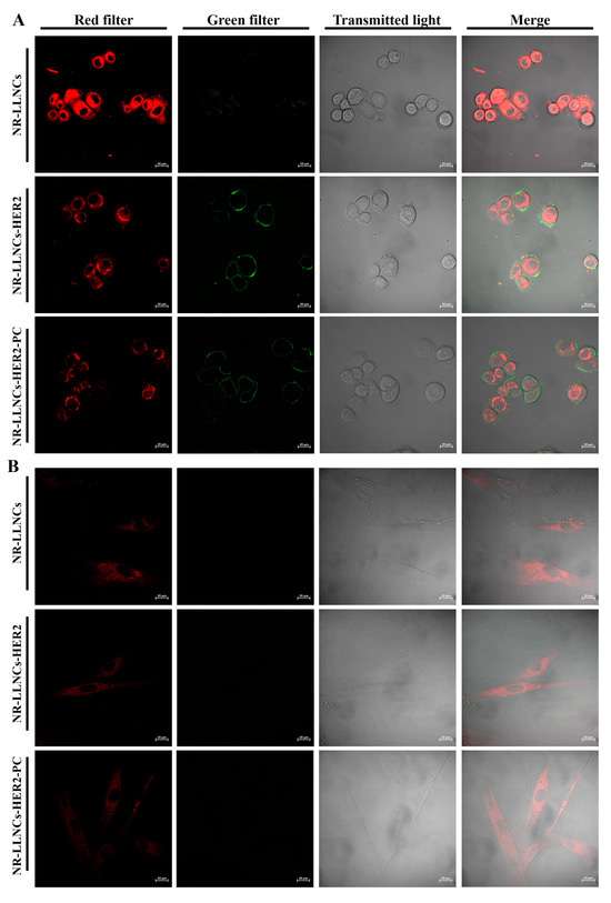 Representative confocal microscopy of (A) SKBR3 and (B) HDFa (scale bar = 20 μm) incubated for 60 min with NR-LLNCs, NR-LLNCs-HER2, and NR-LLNCs-HER2-PC. Red filter and green filter correspond to LLNCs labeled with Nile Red and LLNCs labeled with HER2-FITC, respectively.