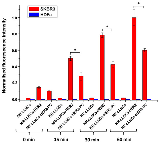 In vitro uptake of NR-LLNCs, NR-LLNCs-HER2, and NR-LLNCs-HER2-PC in both SKBR3 and HDFa analyzed by flow cytometry. Values represent the fluorescence intensity of the merge channels for green and red as NR-LLNCs-HER2 are both red and green fluorescent. Data are mean values ± SD. * p < 0.001 shows the significant values calculated using t-test.