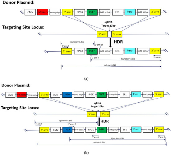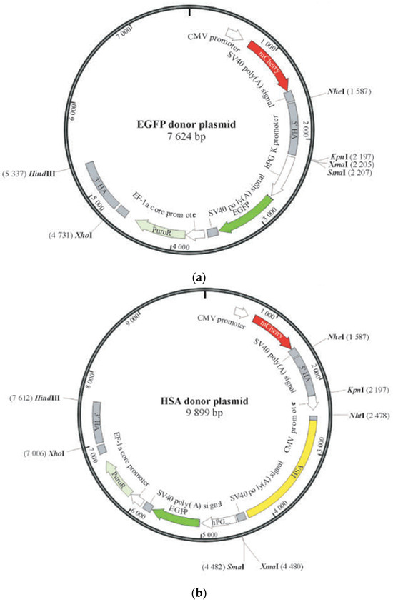 Map of donor plasmids. (a) Map of the EGFP donor plasmid; (b) Map of the HSA donor plasmid.
