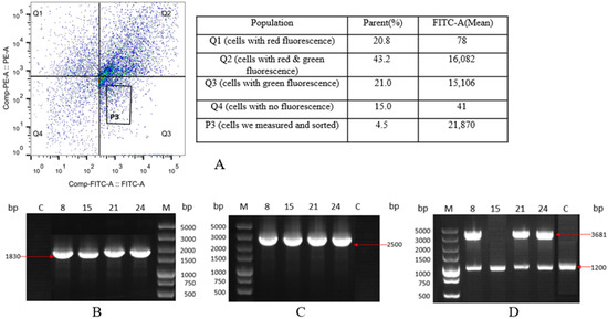 CHO-K1 cell sorting and identification results of site-specific integration of the EGFP gene. (A) Flow cytometric sorting of CHO-K1 cells with the EGFP gene introduced by site-directed integration; (B) Results of 5′ junction PCR, M: DL 5000 DNA marker, lanes 1–5 are: control, K1-EGFP-8, K1-EGFP-15, K1-EGFP-21, K1-EGFP-24; (C) Results of 3′ junction PCR, M: DL 5000 DNA marker, lanes 1–5 are: K1-EGFP-8, K1-EGFP-15, K1-EGFP-21, K1-EGFP-24, control; (D) Results of out–out PCR, M: DL 5000 DNA marker, lanes 1–5 are: K1-EGFP-8, K1-EGFP-15, K1-EGFP-21, K1-EGFP-24, control.