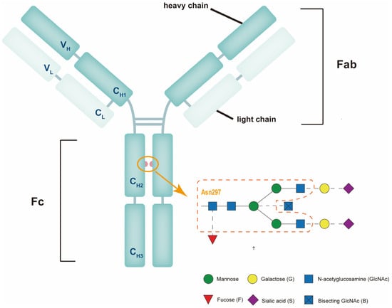 Immunoglobulins are the predominant glycoproteins in the immune system, with IgG being the most abundant in serum. The IgG molecule is a Y-shaped structure comprising four polypeptide chains, two identical 50 kDa heavy (H) chains, and two identical 25 kDa light (L) chains. Each chain is composed of both amino-terminal variable (V) and constant (C) domains. Each heavy chain contains one variable domain (VH) and three constant domains (CH1, CH2, and CH3). Similarly, the light chain contains a variable domain (VL) and a constant domain (CL). The antigen-binding parts are known as Fab fragments, which comprise the VL and CL light chain and the VH and CH1 heavy chain domains []. The Fc fragment is the remaining IgG molecule portion corresponding to the CH2 and CH3 heavy chain domains (Figure 1). Fc fragments do not recognize pathogens; instead, they mediate effector function and molecular interactions, such as antibody-dependent cytotoxicity and immune phagocytosis []. The hinge region is the amino acid sequence that connects the Fab and Fc fragments, allowing the antibody to be flexible [].