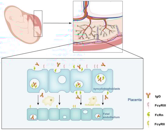 In pregnancy, the placenta serves as the key to immune tolerance and housing the primary protective mechanisms against fetal rejection [,]. The histological barrier placenta provides essential nutrients while facilitating waste transport and promoting fetal growth and development. Multiple active and passive mechanisms allow substances, such as oxygen, glucose, amino acids, and other nutrients, to be exchanged [,]. Immunoglobulin G (IgG) is the only immunoglobulin class that crosses the placenta. While the fetus can produce a small amount of IgG, maternal transport via the placenta is the primary source of IgG in umbilical cord blood [,]. The placenta is a complex organ with the chorionic villus as its basic unit []. Maternal IgG antibodies must travel through three distinct layers of the placenta to reach the fetal circulatory system. The syncytiotrophoblast, the intervillous stroma containing placental fibroblasts and Hofbauer cells, and the fetal vascular endothelium are all traversed during this journey. Among these layers, antibody transfer across the syncytiotrophoblast is significant in ensuring immune protection for the developing fetus [,,].