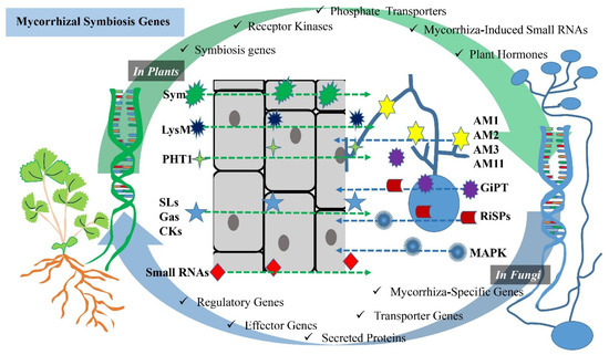 Mycorrhizal symbiosis involves the interaction between plants and mycorrhizal fungi, and several genes in both partners are crucial for the establishment and maintenance of this symbiotic relationship (Figure 1). Some of the key genes and molecular components involved in mycorrhizal symbiosis are established below.