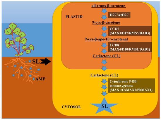 According to Matusova et al. [72], SLs are derived from carotenoids, as evidenced by minimal SL accumulation after treatment with the carotenoid biosynthesis inhibitor fluridone in maize plants. The functional role of SLs can be related to their formation and production in response to the needs of the system during evolution [73]. Since it has been discovered that the gene involved in SL production has been reported for many plant species, including algae and bryophytes, it can be hypothesized that these SLs are important molecules that have long persisted in the evolutionary chain [73]. SLs are four-ring (A–D) compounds that change function by the attachment of various groups to the A and B rings [12,15,73,74]. SLs were initially thought to be sesquiterpene lactones, but were later shown to be apocarotenoid derivatives of carotenoid cleavage mediated by carotenoid cleavage dioxygenase (CCDs) enzymes [75]. A member of the CCD family is involved in the production of various apocarotenoid compounds, such as cyclohexenone and mycorradicin [76]. Initial biosynthesis occurs in plastids with the help of three plastid-specific enzymes: D (DWARF)27, CCD7 and CCD8. Carotenoid isomerase D27, carotenoid cleavage dioxygenases CCD7 and CCD8 and cytochrome P450 monooxygenases were identified as SL biosynthesis enzymes through genetic screening for shoot-branching mutants [15]. Furthermore, from mutants with excessive shoot branching, SL biosynthesis genes were found and called more axillary growth (MAX) in Arabidopsis thaliana [75], Ramosus (RMS) in Pisum sativum [77], decreased apical dominance (DAD) in petunia [78] and dwarf (D) in Oryza sativa [79,80].