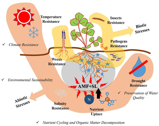 Effects of AMF–SL interaction on biotic and abiotic stress factors. The interaction between AMF and SLs plays an important role in enhancing plant resistance to abiotic and biotic stresses. These synergistic partners can enhance plant resistance to abiotic stresses, such as drought, salinity, temperature extremes and nutrient deficiencies, and biotic stresses, such as disease, pests and weeds. Furthermore, these partners can significantly benefit sustainable agro-ecosystems, such as environmental sustainability, climate resistance, nutrient cycling, organic matter decomposition and the preservation of water quality.