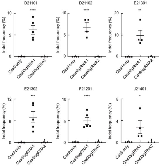 4.4. In Vitro Cleavage Analysis Using the Designed CRISPR/Cas9 RNP