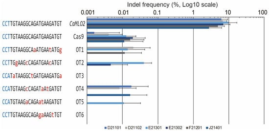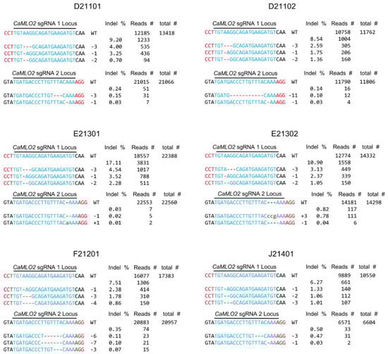 2.5. In Vivo Off-Taget Validation of the CaMLO2sgRNA1 Delivered across the Six Cultivars